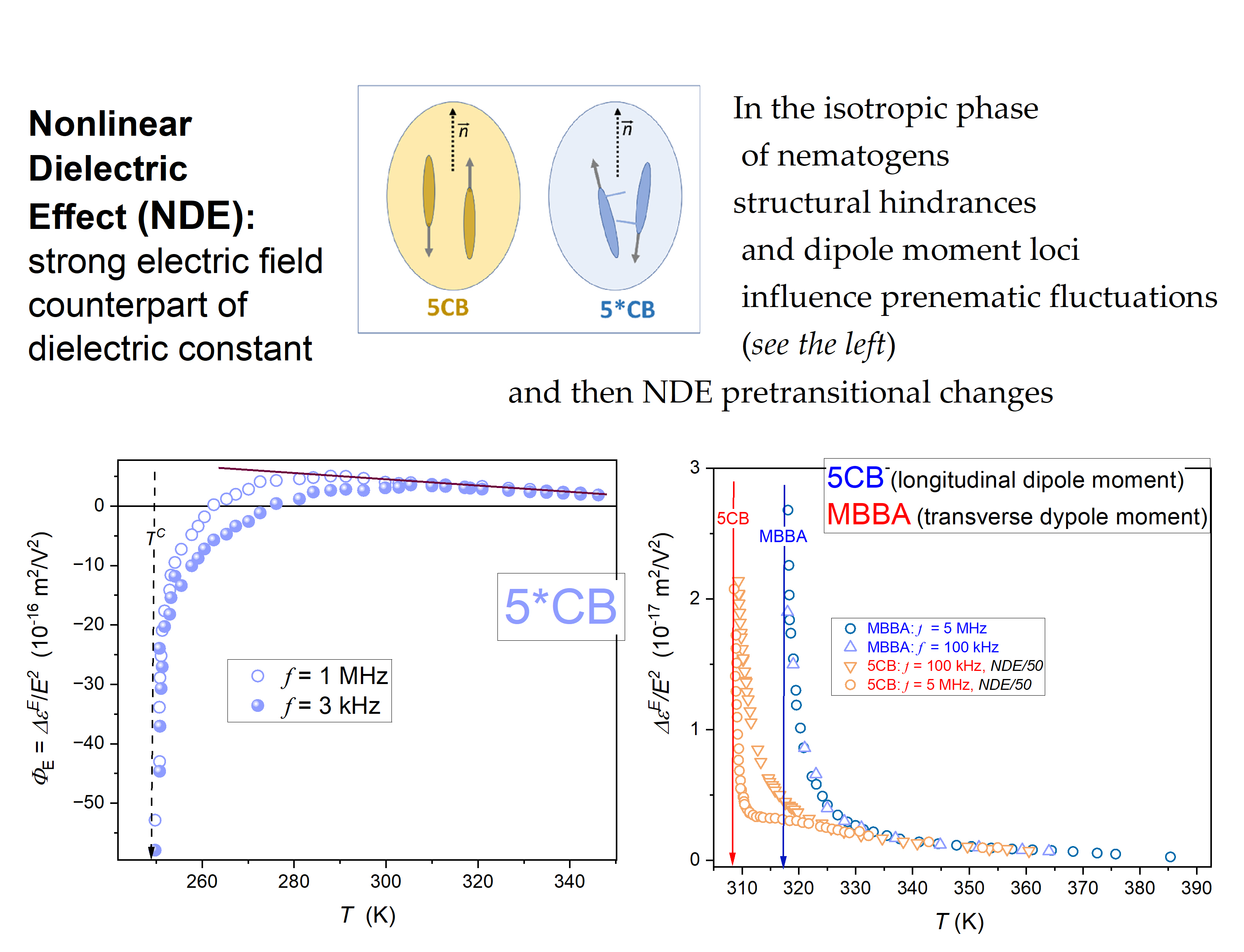 A significant part of the report constitutes the results of focused dielectric constant and nonlinear dielectric effect studies in the isotropic phase of selected LC compounds. Notably, a similar, critical-like pattern has been evidenced for nanocolloidal systems composed of nCB liquid crystals and nanoparticles, such as C