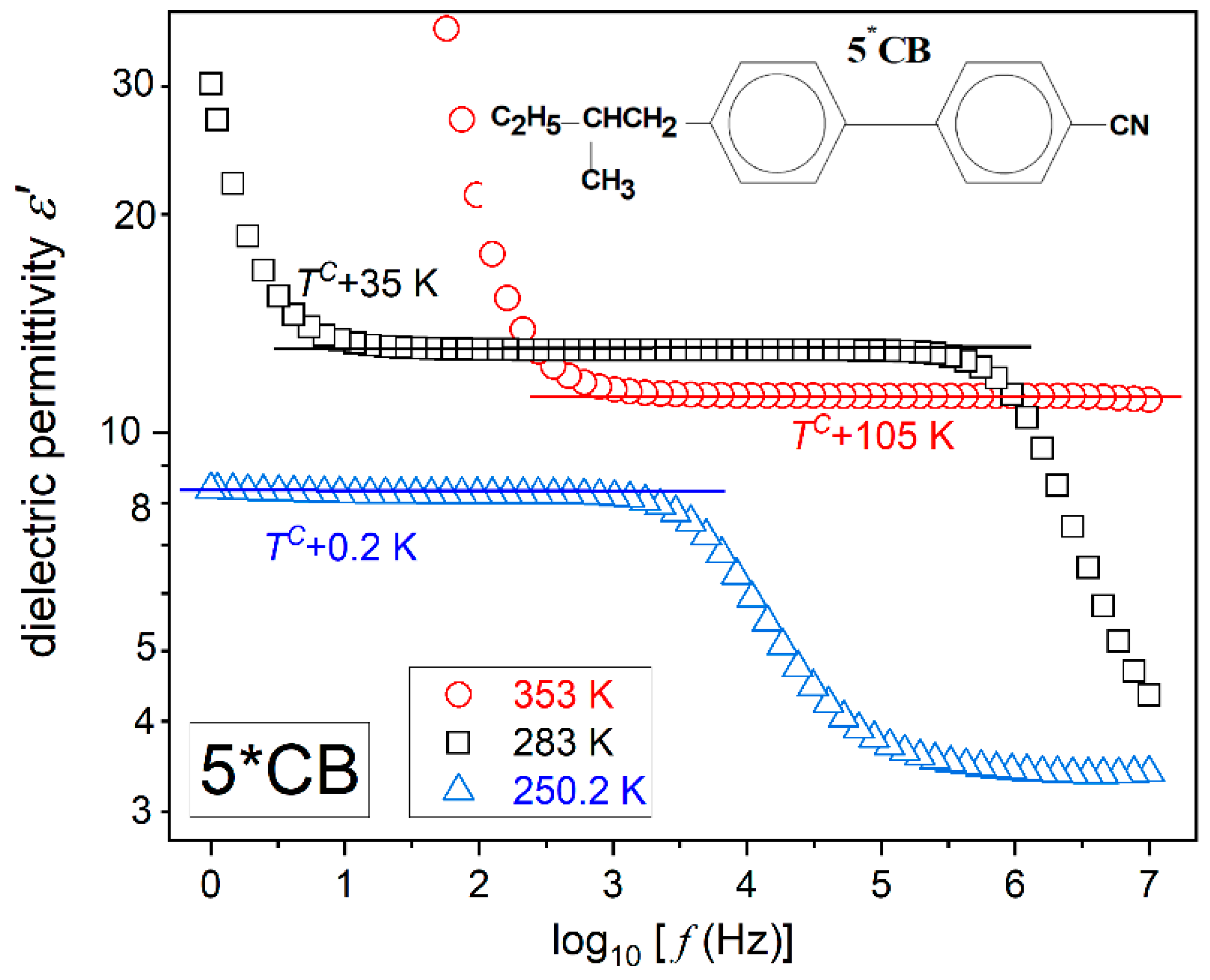 Broadband dielectric spectroscopy studies were carried out using a Novocontrol impedance analyzer, for frequencies from to , with the voltage of the measurement (scanning) electric field , which yields the optimal resolution of measurements. Samples were placed in a flat-parallel capacitor with the gap , which yields for the intensity of the scanning electric field. The capacitor was placed in the Quattro Novocontrol unit for temperature control, enabling stabilization of . Temperature was monitored using a Pt100 thermistor (UnipressEquipment, Warszawa, Poland), placed within one of the capacitor’s plates.