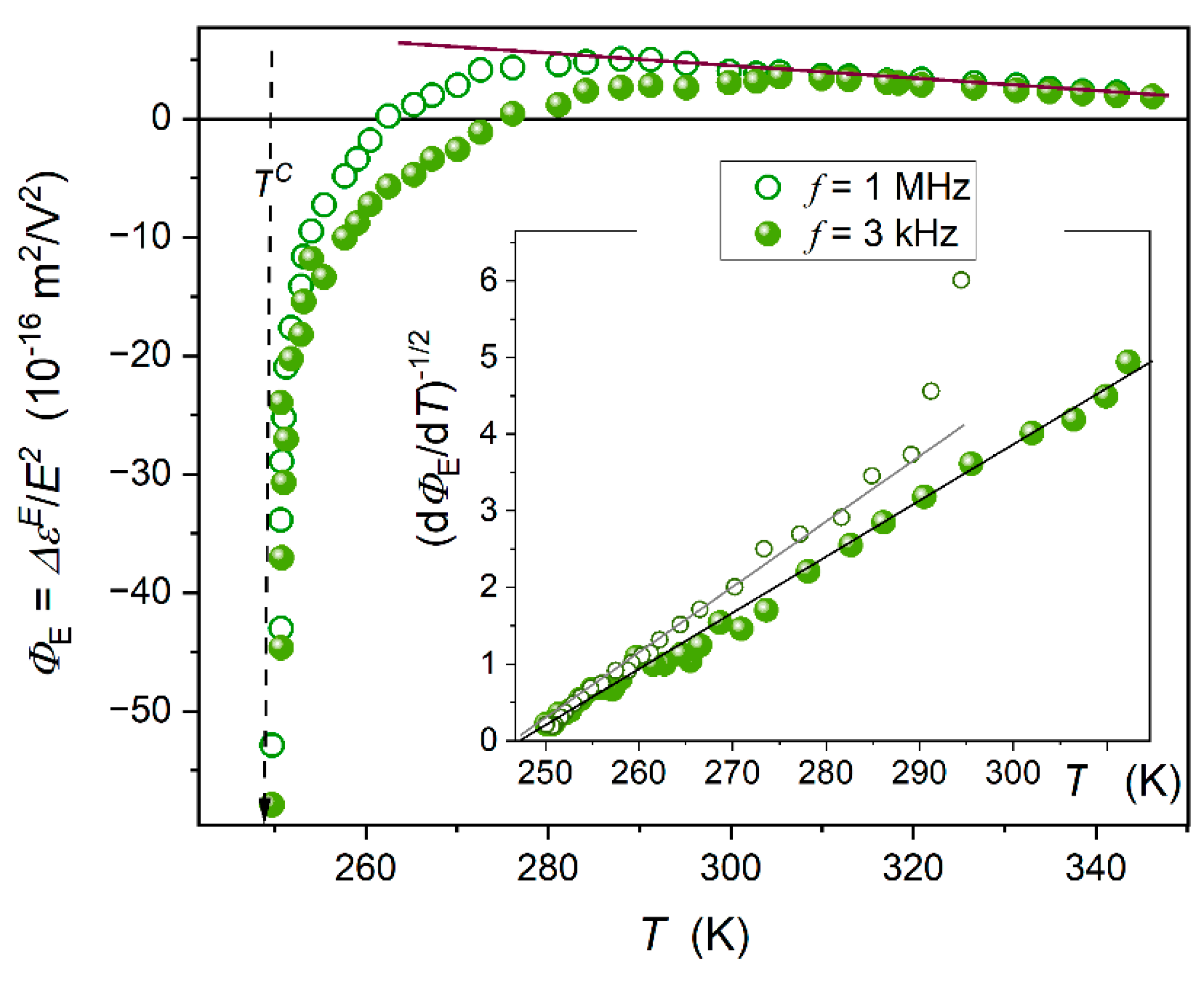 Figure 5. However, on approaching the singular temperature, the compressibility critically rises, which, under the strong electric field, improves uniaxiality. The initial trend diminishes, and the ‘bending down’ in the inset in