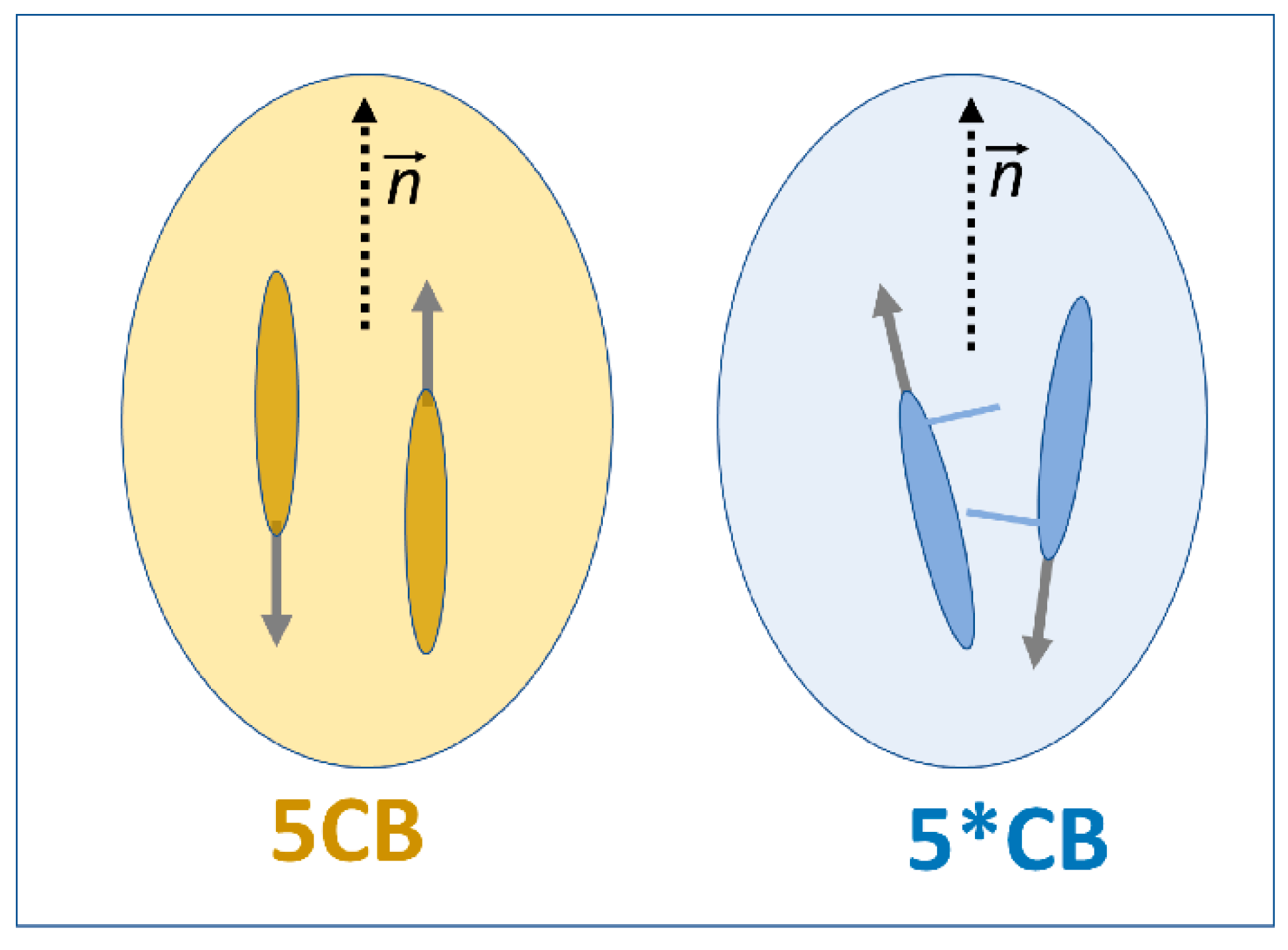 Figure 7 is an idealization. In reality, the molecules are slightly disoriented, and the director indicates only the dominant averaged prenematic direction. Uniaxial ordering improves when approaching the I-N transition, which is also related to the large increase in the number of molecules in the fluctuation. The mentioned methods (KE, CME, and LS), in fact, also detect (anisotropic) fluctuations. Therefore, it can be assumed that the detection using these methods is essentially related to the nondipolar component of dielectric polarization component in the direction indicated by the director