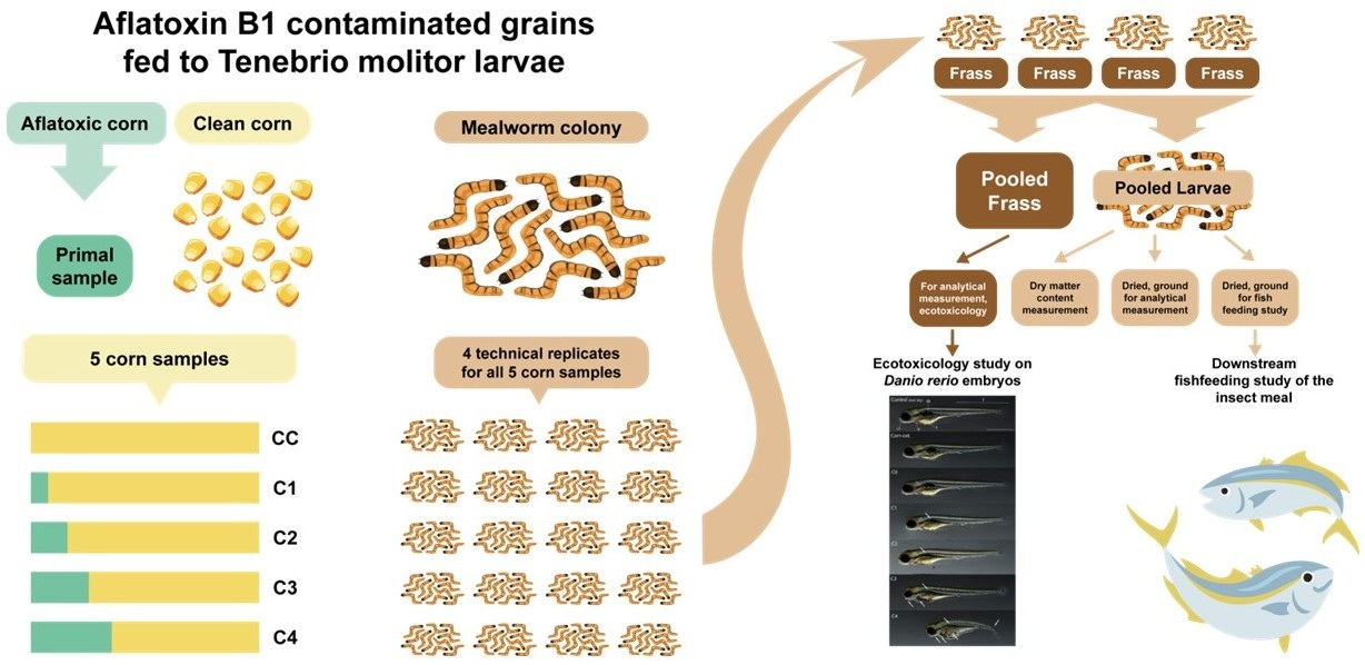 Based on these results we took one step further from the analytical studies and arranged our research with the aim of evaluating whether the utilization of certain mycotoxin-contaminated crops by insects is a possible way of producing feed grade insect meal. Thus, in our study we worked with the larvae of yellow mealworm (Tenebrio molitor) because of the relevance of this species in the insect industry and the ease of breeding. The AfB1 mycotoxin was chosen for testing because of its reputation and the fact that, to date, it is the only mycotoxin that is strictly regulated in feed components in our country. Our aim was to utilize crops that highly exceed the AfB1 threshold of 20 µg/kg and convert them to a fish feed component, via insect production. To investigate, the mealworms were fed on the contaminated crop for several weeks, insect meal was prepared from them, and we analyzed their AfB1 content by HPLC MS/MS in an accredited laboratory to quantify whether the quality fits the regulation. Measuring fish toxicity of insect products and residual frass was also a part of our study to verify their applicability in practice.