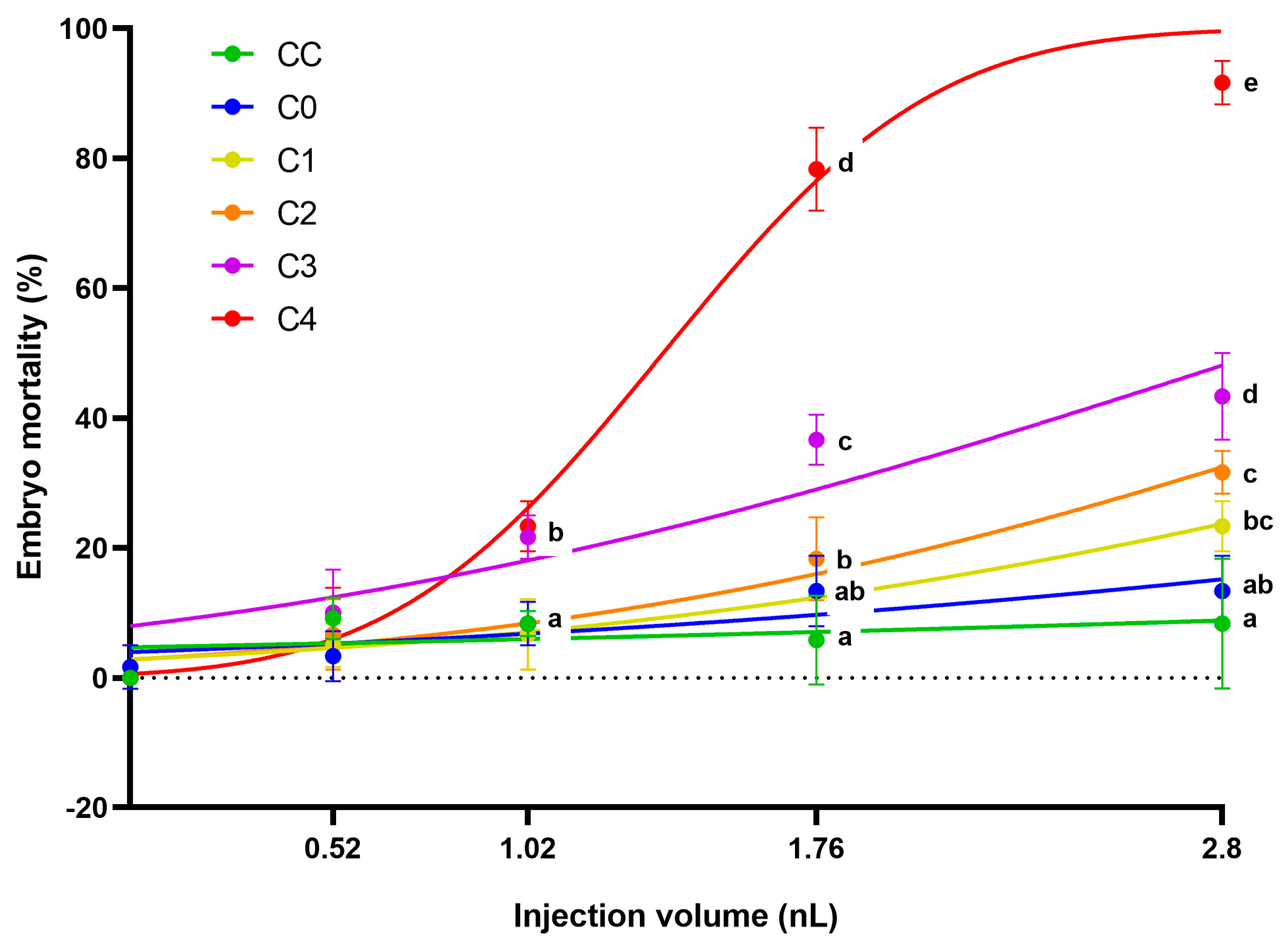 The 12.5 mg/mL concentrated extracts of control corn (CC), the frass produced by larvae from it (C0), and the frass produced from the different toxin-containing corns (C1–C4) were injected at four different volumes (0.52, 1.02, 1.76, and 2.8 nL). In general, it can be said that increased injected volume caused higher mortality in the case of AfB1-containing frass extracts (