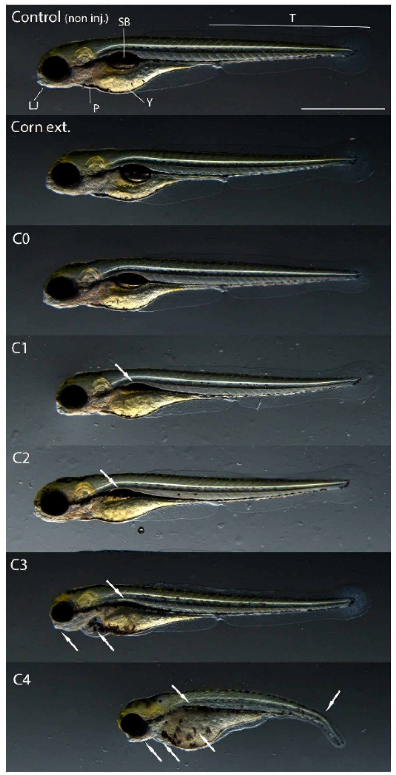In addition to mortality, sublethal endpoints were also analyzed in the case of surviving embryos injected with the 2.8 nL volume after 120 h of exposure. The extracts from corn containing no toxin (C0) and the frass formed from it (CC) did not cause phenotypic changes in the treated embryos compared to the non-injected control. However, sublethal effects of frass extracts (C1–C4), which originated from AfB1-containing larvae feeding experiments, were detected. The most characteristic symptom was uninflated swim bladders, which appeared in all treated embryos. In addition, in the individuals treated with C3 and C4, there was a deformity of the lower jaw and pericardial edema. Deformity of the yolk sac and curvature of the tail region were only seen in embryos injected with the (highly AfB1-contaminated) C4 sample (