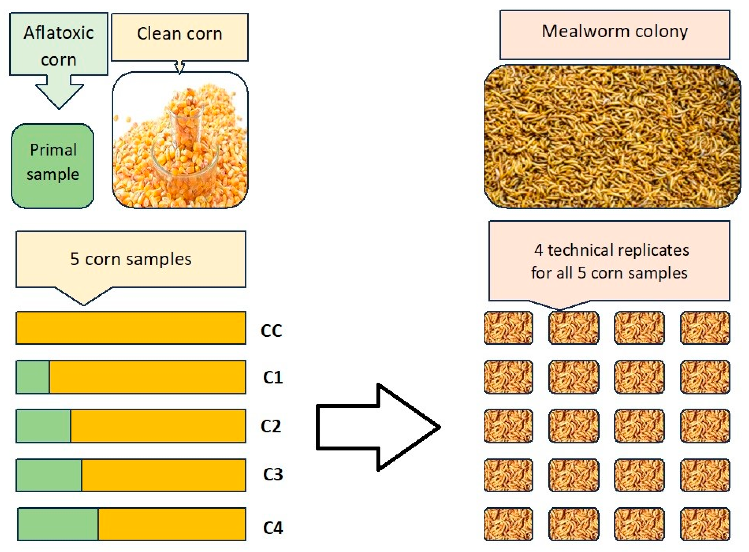 A possible application of mealworm larvae, in circular agriculture, is to feed them to aquacultured fish. Our fish feeding experiment aimed to feed rearing stage common carp (Cyprinus carpio) fries with the mealworm larvae previously fed an AfB1-contaminated corn diet. The experiment was carried out in a recirculation fish rearing unit in our institute. Pooled and dried Tenebrio molitor larvae from the control (CC) and highly AfB1-contaminated-corn-fed larvae groups (C4) were further ground, then sorted into 0.2–0.4 mm particles which is the same size as the generally used fish feed “Infa” (Aller Aqua Polska Sp. z.o.o., Golub-Dobrzyn, Poland).