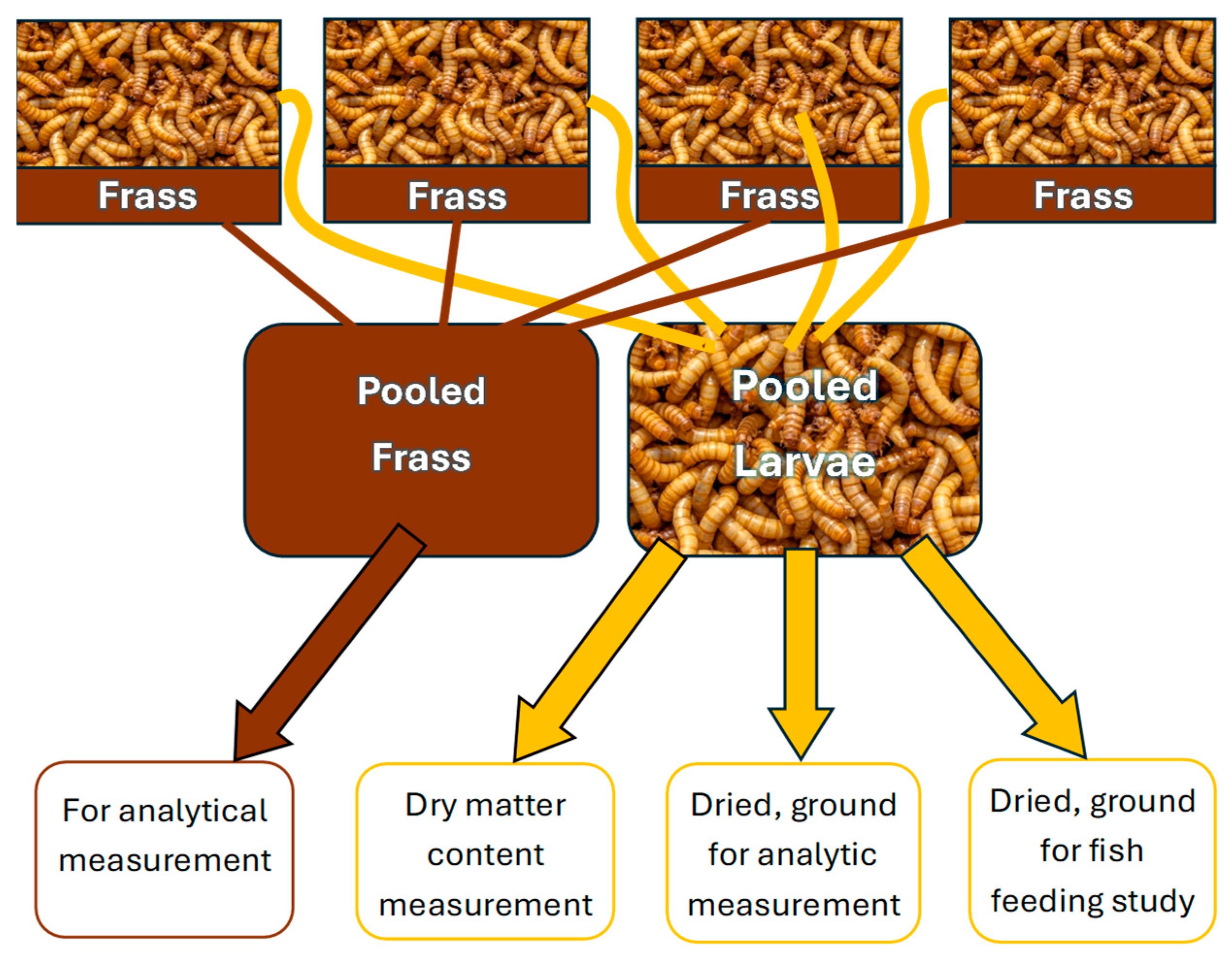 By the end of the 35-day feeding period the larvae consumed most of the provided feed, increased their body size, and produced a notable amount of excrement. The excrement of the larvae and the unconsumed feed (frass) was collected from the bottom of the containers at the end of the feeding period. The insects were sorted from the frass by a wire jig and inspected to look for mortality signs. Insects and their frass were stored separately by concentrations and their replicates. Inactivation of the larvae happened during freezing at −20 °C. The larvae of the 4 technical replicates within each group were pooled. Twenty individuals from each pooled group of larvae were measured for wet weight and then dried at 60 °C for 24 h to calculate the dry matter content. The remaining larvae were also dried and ground by a laboratory mortar, then 5 g was sent for analytical measurement. The remaining dried and ground larvae were stored by group in 15 mL Falcon tubes at −20 °C before the fish feeding study. Frass from each of the 4 technical replicates was pooled to create samples and sent to Eurofins Hungary Ltd. together with larvae samples for HPLC MS/MS (