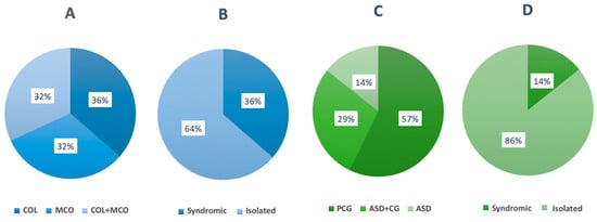 Distribution of clinical features in patients with MAC (A,B) and ASD/PCG (C,D). COL = coloboma, MCO = microphthalmia, PCG = primary congenital glaucoma, ASD = anterior segment dysgenesis.