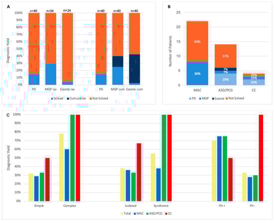 Diagnostic yield—(A) for each diagnostic step, (B) by phenotypic groups and (C) by different clinical feature subgroups. PD = primary diagnostics, MGP = multigene panel, n = number of patients, iso = isolated, cum = cumulative, FH +/− = family history positive/negative.