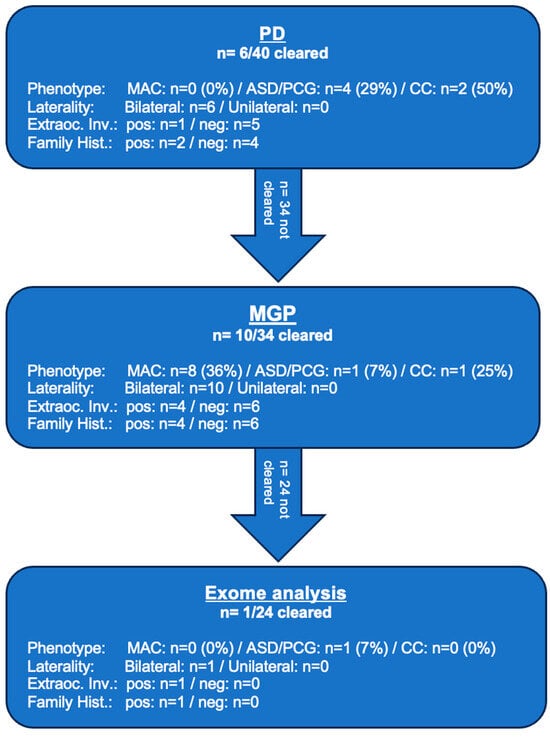 Among phenotype groups, the highest yield was in CC (75%), followed by ASD/PCG (43%) and MAC (36%) (Figure 2B). No causative variants were found in unilateral cases, while bilateral phenotypes had a 46% yield (CC: 75%, ASD/PCG: 46%, MAC: 40%). Patients with simple ocular phenotypes had a 32% DY (CC: 50%, ASD/PCG: 33%, MAC: 29%) versus 78% in those with additional ocular findings (CC: 100%, MAC: 60%, ASD/PCG: 100%). Syndromic or extraocular features were associated with a 55% yield (CC: 100%, ASD/PCG: 100%, MAC: 38%) compared to 38% (CC: 67%, ASD/PCG: 33%, MAC: 36%) in isolated ocular cases. A positive family history increased DY to 70% (MAC: 75%, ASD/PCG: 75%, CC: 50%), while cases without it had a 33% DY (CC: 100%, ASD/PCG: 30%, MAC: 28%) (Figure 2C). Figure 3 illustrates the results obtained in each diagnostic step.