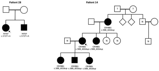 In patient 14, a novel duplication c.588_602dup (p.Gln197_Tyr201dup) in CRYBB1 was found in a patient with bilateral cataracts. The variant segregated in all affected family members (Figure 4). Despite its formal classification as VUS, when viewed in the context of clinical and genetic data, this variant is to be considered as highly likely causative, especially since no other causative variant could be identified. Patient 28 with bilateral microphthalmia carries a novel homozygous variant c.572T>A (p.Ile191Lys) in MFRP, which currently is classified as VUS. However, this variant is very likely to be pathogenic, according to the clinical and genetic findings, especially since the same variant was confirmed in the similarly affected sibling (Figure 4).