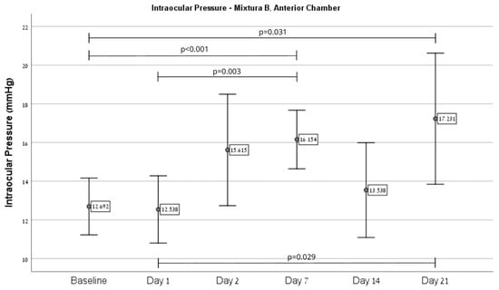 A significant difference in IOP over time was demonstrated in eyes injected with Mixture B to the anterior chamber. Post hoc pairwise comparison showed significant differences in IOP between baseline and day 7 (p < 0.001), baseline and day 21 (p = 0.031), between days 1 and 7 (p = 0.003), and between days 1 and 21 (p = 0.029).