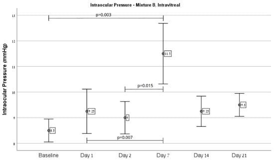 Overall, an increase in IOP was observed in eyes injected with Mixture B (n = 21) from baseline (11.0 ± 2.83) on day 21 (14.29 ± 5.81, p = 0.012), as depicted in Figure 1. Regarding injection site effects, Mixture B intracameral injections (n = 13) showed an increase from baseline (12.69 ± 2.43) on day 7 (16.15 ± 2.51, p < 0.001) and 21 (17.23 ± 5.61, p = 0.031), as depicted in Figure 2. Injection to the vitreous (n = 8) demonstrated an increase from baseline (8.5 ± 0.53) on day 7 (11.5 ± 1.41, p = 0.003), as depicted in Figure 3.