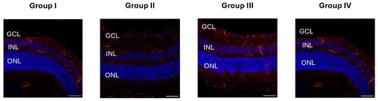 Iba1 immunostaining of retinal sections. Iba1 staining (red) revealed no significant differences in microglial distribution or morphology across experimental groups, indicating that none of the injection conditions (hydrogel composition or injection site) induced detectable retinal inflammation. Nuclei were counterstained with DAPI (blue). Group I: intracameral injection of Mixture A; Group II: intravitreal injection of Mixture A; Group III: intracameral injection of Mixture B; Group IV: intravitreal injection of Mixture B. Representative merged images are shown for each group. Scale bar = 50 μm.