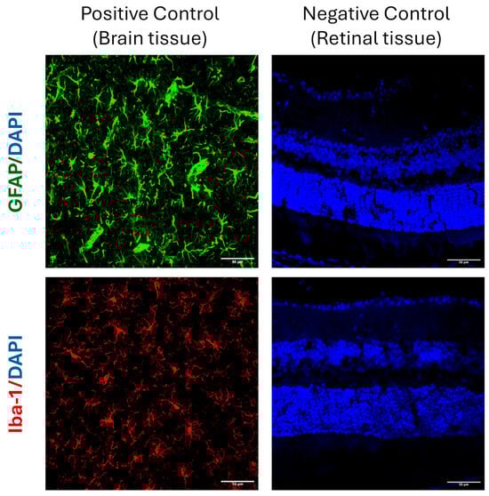 Positive and negative controls for immunofluorescence staining. Representative images demonstrating antibody specificity for GFAP (green) and IBA-1 (red). Brain tissue served as a positive control and shows robust astrocytic and microglial immunoreactivity. Retinal sections processed in parallel with omission of primary antibodies served as negative controls and exhibited no detectable signal, confirming the absence of nonspecific staining. Nuclei were counterstained with DAPI (blue). Scale bar = 50 µm.