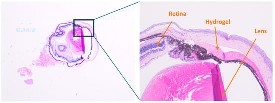 Localization of hydrogel following intracameral injection. Hematoxylin and eosin (H&E) staining shows the presence of hydrogel (Mixture A) at the anterior chamber angle immediately after a single intracameral injection. The zoomed-in image highlights the hydrogel material situated between the cornea and lens, adjacent to the trabecular meshwork. Retinal and lens structures are identifiable, confirming proper anatomical orientation and successful delivery of the hydrogel to the target site. Minor sectioning artifacts, including gaps and tissue folds, are present but do not interfere with interpretation of the key anatomical features. Histological assessment was performed on multiple sections from each eye to ensure reliability of the observations.