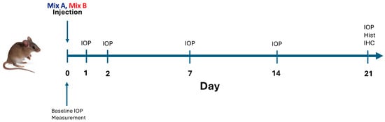 IOP measurements were performed using a rebound tonometer calibrated for mice (Icare® TonoLab, Vantaa, Finland). Measurements were taken at baseline (prior to intervention) and on days 1, 2, 7, 14, and 21 following hydrogel injection. Figure 8 presents the study design and timeline. All measurements were performed under anesthesia and repeated three times per eye. The average of the three readings was calculated and recorded.