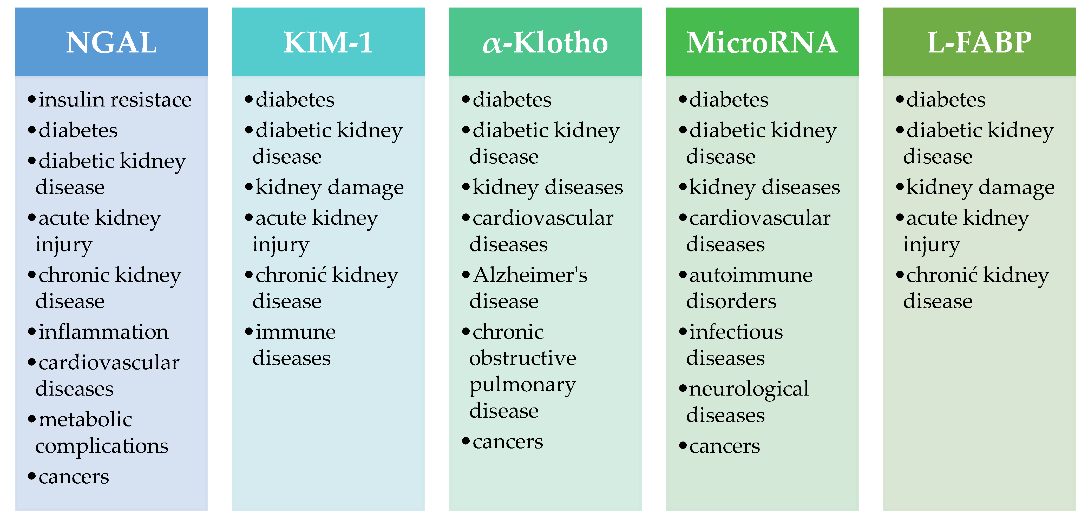 - Piwkowska, A.; Zdrojewski, Ł.; Heleniak, Z.; Dębska-ślizień, A. Novel Markers in Diabetic Kidney Disease—Current State and Perspectives. Diagnostics 2022, 12, 1205. [Google Scholar] [CrossRef]
