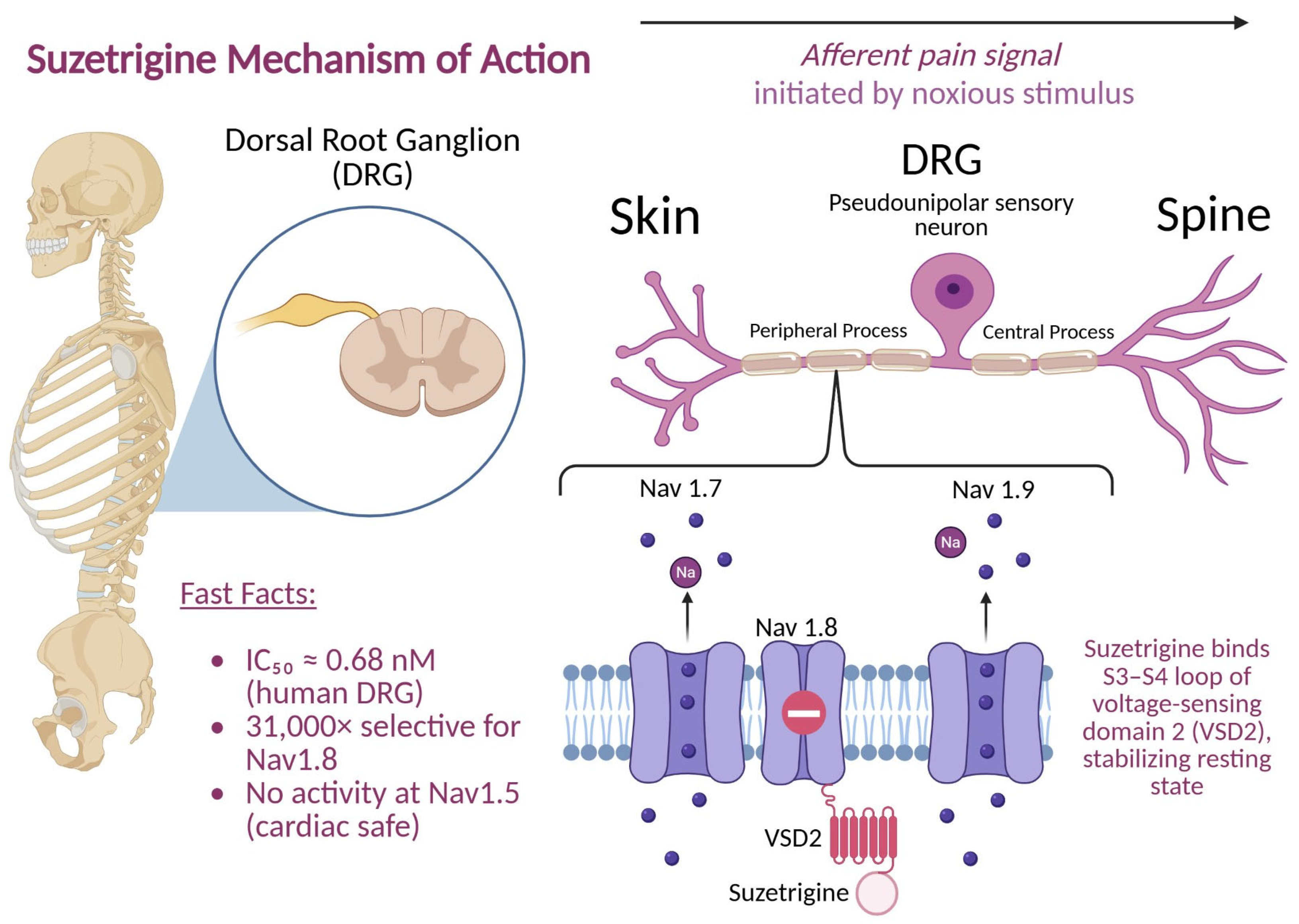 13]. Because Nav1.8 channels are not present in the CNS, the central side effect risk is theoretically minimal. Vertex Pharmaceuticals utilized this information to develop suzetrigine as a highly selective Nav1.8 antagonist in humans [