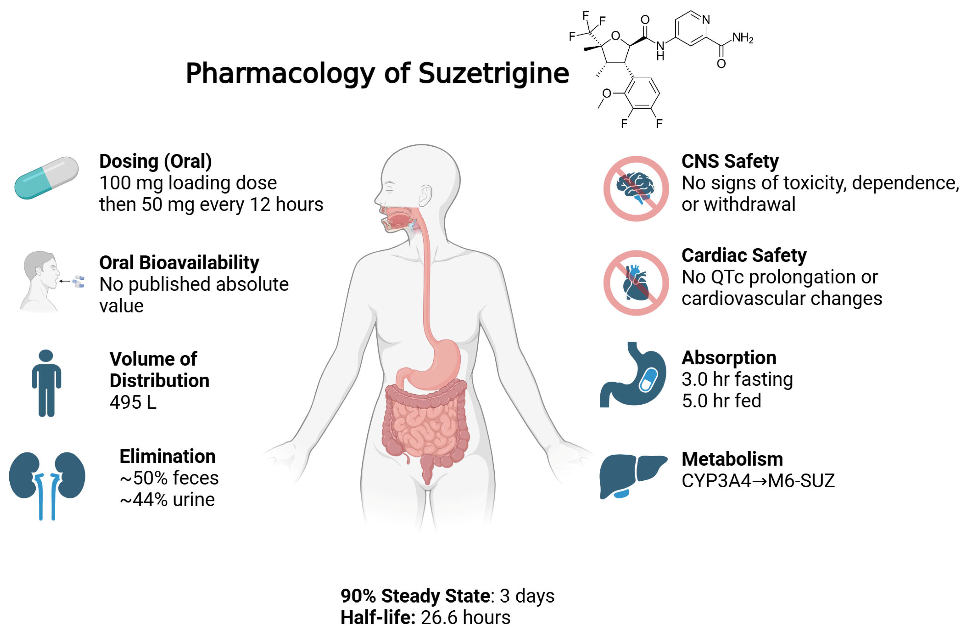 22]. Given this pathway, caution is warranted when suzetrigine is administered with other drugs that are substrates, inducers, or inhibitors of CYP3A4. Common analgesic CYP34A substrates include acetaminophen and codeine, potentially complicating multimodal use. Suzetrigine is contraindicated with strong CYP3A4 inhibitors such as ketoconazole, as suzetrigine plasma levels may increase substantially, potentially leading to toxicity [
