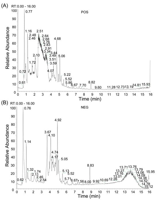 Qualitative Analysis of Compounds in BHBE. (A) Total Ion Chromatogram (TIC) in positive ion mode. (B) TIC in negative ion mode.