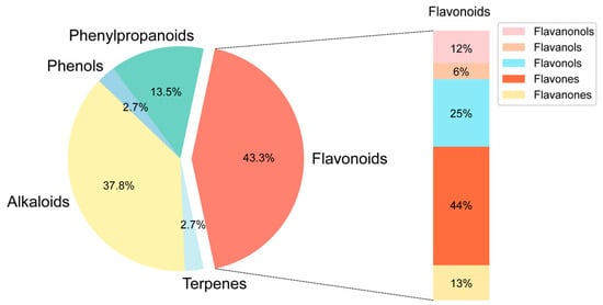The chemical composition of BHBE was qualitatively analyzed using liquid chromatography-tandem mass spectrometry (LC-MS/MS), resulting in the identification of 832 compounds (Figure 1 and Supplementary Table S1). Active compounds were screened using the Traditional Chinese Medicine Systems Pharmacology Database (TCMSP) and Swiss ADME databases, yielding 37 major bioactive compounds (Table 1), predominantly comprising flavonoids, alkaloids, and phenylpropanoids (Figure 2). The Swiss Target Prediction database was then used to predict the relevant targets of these active compounds, ultimately identifying 592 protein targets (Supplementary Table S2) associated with the active compounds.