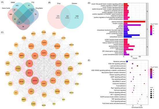 Network Pharmacology Analysis of BHBE in the Treatment of T2DM. (A) Venn diagram of T2DM-related targets, which were obtained from Gene Cards Database, Online Mendelian Inheritance in Man Database (OMIM), Thera-peutic Target Database (TTD) and DrugBank databases. (B) Venn diagram of common “drug-disease” targets. (C) Core target protein–protein interaction (PPI) network. (D,E) Gene Ontology (GO) and Kyoto Encyclopedia of Genes and Genomes (KEGG) pathway enrichment analysis of the common targets.