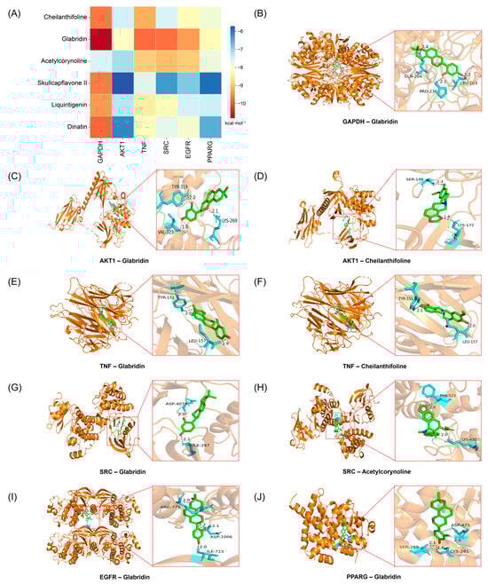 In this study, the top six active compounds and core target proteins, selected based on their degree values, were subjected to molecular docking simulations. The results indicated that the active compounds in BHBE, including cheilanthifoline, glabridin, acetylcorynoline, skullcapflavone II, liquiritigenin, and dinatin, exhibited binding energies with the core target proteins, such as GAPDH, AKT1, TNF, SRC, EGFR, and PPARγ, all lower than −5 kcal·mol−1, suggesting stable interactions between the key bioactive compounds and their targets (Figure 5A and Supplementary Table S9). Notably, cheilanthifoline, glabridin and acetylcorynoline exhibited markedly lower binding energies (≤−7 kcal mol−1) with GAPDH, AKT1, TNF, SRC and EGFR than with the remaining targets, implying preferential recognition of these three ligands by the pivotal proteins implicated in glycolytic flux, insulin signalling and inflammatory cascades. Visualization of the docked complexes in PyMOL (Figure 5B–J) revealed that the interactions are exclusively non-covalent in nature, dominated by a dense network of hydrogen bonds. These non-covalent forces collectively confer conformational stability to the ligand–protein interfaces, thereby providing a structural basis for the observed high-affinity recognition and subsequent functional modulation of the key metabolic and pathways.