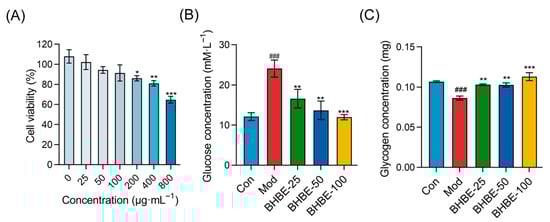 The Cell Counting Kit-8 assay was used to assess the effect of BHBE on HepG2 cell viability in order to determine its safe dosage range (Figure 6A). The results showed that when the mass concentrations of the extract were 25 μg·mL−1 (BHBE-25), 50 μg·mL−1 (BHBE-50), and 100 μg·mL−1 (BHBE-100), the viability of HepG2 cells remained above 90%, with no significant cytotoxicity observed. However, when the mass concentrations were increased to 200 μg·mL−1 (BHBE-200), 400 μg·mL−1 (BHBE-400), and 800 μg·mL−1 (BHBE-800), cytotoxicity increased with concentration, and cell viability significantly decreased (p < 0.001). Based on these results, the appropriate doses of the BHBE were determined to be 25 μg·mL−1, 50 μg·mL−1, and 100 μg·mL−1.