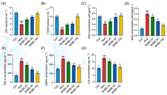 Effects of BHBE on Oxidative Stress and Inflammation in the IR-HepG2 Cell Model. (A,B) Effects of different concentrations of BHBE on the activities of antioxidant enzymes CAT and SOD. (C,D) Effects of different concentrations of BHBE on GSH and MDA levels. (E–G) Effects of different concentrations of BHBE on the levels of inflammatory cytokines TNF-α, MMP9, and IL-6. Con, control group; Mod, model group; BHBE-25, BHBE-50, and BHBE-100 represent BHBE at concentrations of 25 μg·mL−1, 50 μg·mL−1, and 100 μg·mL−1, respectively. Values are presented as mean ± SD (n = 3). Statistical analysis was performed using one-way ANOVA followed by Tukey’s post hoc test for multiple comparisons. ## and ### indicate comparisons with the Con group (p < 0.01 and p < 0.001, respectively); *, **, and *** indicate comparisons with the Mod group (p < 0.05, p < 0.01, and p < 0.001, respectively); “ns” indicates no significant difference compared to the Mod group.