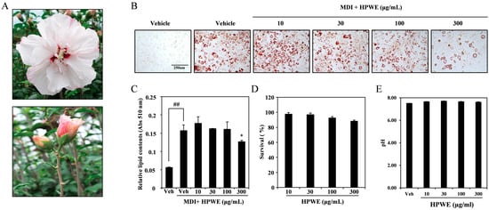 The water extract of Hibiscus syriacus bud ‘Pyeonghwa’ (HPWE) reduces lipid accumulation in 3T3-L1 cells. (A) Image of Hibiscus syriacus ‘Pyeonghwa’ buds. (B) Representative images depicting HPWE-induced differentiation of 3T3-L1 pre-adipocytes. scale bar is 250 μm. (C) Quantitative analysis corresponding to panel (B). Statistical significance is indicated as ## p < 0.01 (compared to negative control) and * p < 0.05 (compared to positive control). Data are presented as mean ± SD (n = 3). Comparisons between two groups (negative control vs. positive control, or positive control vs. treatment) were analyzed using Student’s t-test. (D) Viability of 3T3-L1 cells following HPWE treatment, measured by absorbance (Abs). (E) Changes in the pH of culture media expressed as a percentage following HPWE treatment.