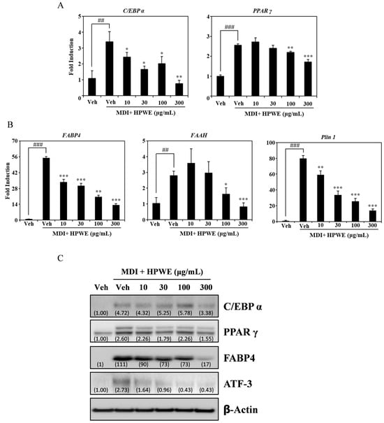 Adipocyte differentiation necessitates the expression of multiple transcription factors, notably PPARγ and C/EBPα [,]. The process of adipogenesis is initiated through the interaction between C/EBPα and PPARγ []. Consequently, the inhibition of PPARγ and C/EBPα represents a potential strategy for the prevention and treatment of obesity. In this study, we observed that HPWE suppresses the expression of PPARγ and C/EBPα at both the transcriptional and protein levels. Consistent with these findings, previous research on the anti-obesity effects of Hibiscus sabdariffa extract demonstrated that its inhibitory action is mediated via PPARγ and C/EBPα []. Additional studies have identified several other markers associated with adipogenesis. Specifically, the inhibition of PPARγ and C/EBPα in 3T3-L1 cells leads to a downregulation of their differentiation []. While PPARγ and C/EBPα are implicated in the early stages of 3T3-L1 cell differentiation, FABP4 and PLIN1 are involved in the intermediate phase []. FABP4 is markedly expressed throughout adipocyte differentiation and is transcriptionally regulated by PPARγ []. The mammalian integral membrane enzyme FAAH is responsible for the degradation of fatty acid amide endogenous signaling lipids []. Notably, FAAH expression is upregulated by a high-fat diet, whereas treatment with germinated soy germ extract, which exhibits anti-obesity properties, reduces FAAH expression []. In the present investigation, HPWE was found to inhibit the expression of both FABP4 and FAAH. Furthermore, PLIN1 facilitates the expression of genes related to lipid metabolism at the mRNA and protein levels []. High-density lipoprotein induces activation of the transcription factor ATF-3 as a target gene in macrophages []. Our results indicate that HPWE treatment attenuates the expression of PLIN1 and ATF-3, thereby supporting the hypothesis that HPWE exerts anti-obesity effects in vitro. Collectively, these findings suggest that HPWE reduces adipocyte lipid accumulation through the inhibition of PPARγ and C/EBPα, as well as by suppressing multiple markers involved in adipocyte differentiation.