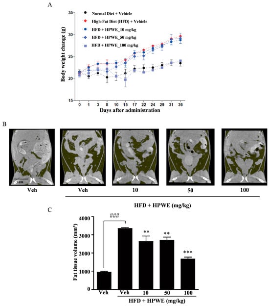 We conducted experiments using mice fed a high-fat diet (HFD) to evaluate the anti-obesity effects of HPWE in vivo. The HPWE-treated group demonstrated a lower rate of weight gain compared to the HFD group (Figure 3A). To further elucidate the anti-obesity effects of HPWE in HFD-fed mice, whole-body fat accumulation was assessed using micro-computed tomography (micro-CT). The HFD group exhibited greater body fat accumulation than the vehicle group (Figure 3B). In contrast, mice treated with HPWE showed a reduction in body fat relative to the HFD group (Figure 3C). These findings indicate that HPWE exerts anti-adipogenic effects in a mouse model of HFD-induced obesity.