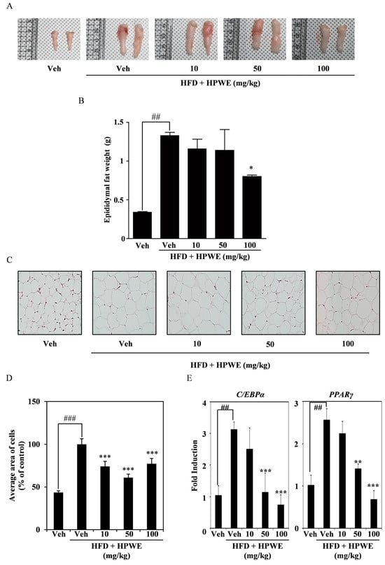 Numerous mouse models of obesity have been developed previously. The first is an HFD-fed mouse model, and the second is a leptin-deficient (ob/ob) mouse model. Although the latter does not accurately represent human obesity, diet-induced obesity models are considered more representative of the human condition []. Therefore, we selected the HFD mouse model for our study. HFD feeding resulted in body weight gain, which was inhibited by treatment with HPWE. Notably, the HPWE-treated group exhibited a reduction in abdominal fat tissue. Epididymal white adipose tissue (WAT) secretes various cytokines that regulate metabolism in organs and tissues during HFD-induced obesity []. Our results demonstrated that both the size and weight of epididymal WAT decreased following HPWE treatment. Furthermore, a five-week treatment with HPWE significantly reduced the level of epididymal WAT. The growth of epididymal WAT is observed at an early stage in mice with diet-induced obesity []. The reduction in epididymal WAT mass is attributed to decreases in both the size and number of adipocytes []. The mRNA expression levels of PPARγ and C/EBPα in epididymal WAT were observed to decrease following treatment with HPWE. Collectively, these findings suggest that HPWE inhibits adipocyte differentiation both in vitro and in vivo in high-fat diet-induced obesity through the suppression of PPARγ.