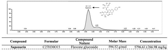 Quantitative Analysis of Saponarin Content in HPWE using LC-MS/MS. A saponarin ion chromatogram of HPWE produced by Liquid chromatography-mass spectrometry (LC-MS/MS) analysis.