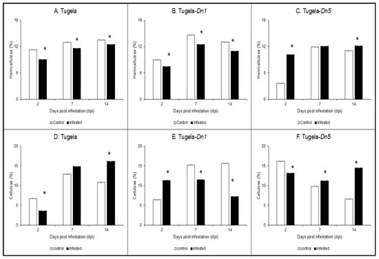 Analysis of hemicellulose (A–C) and cellulose (D–F) content in cell walls of Tugela, Tugela-Dn1, and Tugela-Dn5 after infestation by RWASA2 for 2, 7, and 14 days. Control represents uninfested samples, and experiments were conducted in biological triplicate. The mean ± SD represents the values and error bars. ANOVA was used to calculate the significant differences between the treatments, and the p-value was set at p ≤ 0.05. The Tukey HSD post-hoc test (p ≤ 0.05) was performed to determine the significant differences represented by the asterisk (*) within the infested and uninfested.