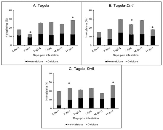 Analysis of the holocellulose content in the cell wall of Tugela (A), Tugela-Dn1 (B), and Tugela-Dn5 (C) after 2, 7, and 14 days post-RWASA2 infestation. Control represents the uninfested samples, and experiments were conducted in biological triplicate. The mean ± SD represents the values and error bars. ANOVA was used to calculate the significant differences between the treatments, and the p-value was set at p ≤ 0.05. The Tukey HSD post-hoc test (p ≤ 0.05) was performed to determine the significant differences represented by the asterisk (*) within the infested and uninfested treatments.