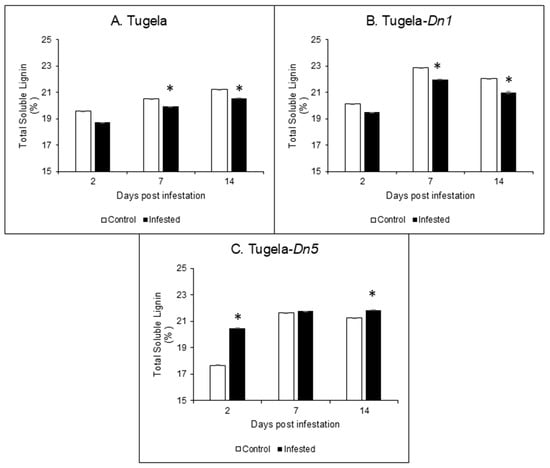 Analysis of the soluble lignin content in the cell walls of Tugela (A), Tugela-Dn1 (B), and Tugela-Dn5 (C) after 14 days of RWASA2 infestation. Control represents the uninfested samples, and experiments were conducted in biological triplicate. The values and error bars represent the mean ±SD. ANOVA was used to calculate the significant differences between the treatments, and the p-value was set at p ≤ 0.05. The Tukey HSD post-hoc test (p ≤ 0.05) was performed to determine the significant differences represented by the asterisk within the infested and uninfested treatments.