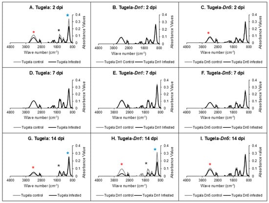 FTIR spectroscopy profiles of susceptible Tugela, moderate resistant Tugela-Dn1 and resistant Tugela-Dn5 cell walls (A–I). The spectra demonstrate the changes in the absorbance of functional groups in the cell walls of the RWASA2-infested and uninfested wheat cultivars at 2, 7, and 14 days post-infestation. Keys: * = cellulose region (3400-3000 cm−1); * = holocellulose region (1019 cm−1); * = lignin region (1600-1500 cm−1).