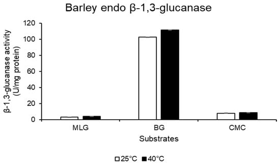 Barley β-1,3-glucanase substrate specificity analysed on mixed-linked β-1,3-1,4-glucan (MLG), β-1,3-glucan (curdlan: BG), and β-1,4-glucan (AZO-carboxymethyl cellulose: CMC) substrates. Reactions were conducted at 25 and 40 °C. The experiments were conducted in technical triplicate. The mean ± SD represents the values and error bars.