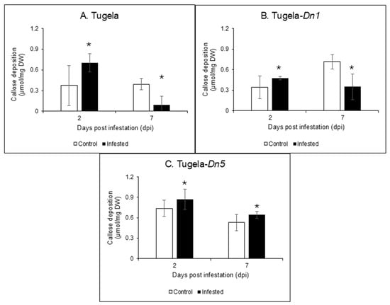 Analysis of callose content in the cell wall biomass of Tugela (A), Tugela-Dn1 (B), and Tugela-Dn5 (C) after 2 and 7 days of RWASA2 infestation. Control represents the uninfested treatment, and experiments were performed in biological triplicate. The values and error bars represent means ± SD, respectively. ANOVA was used to calculate the significant differences between the treatments, and the p-value was set at p ≤ 0.05. The Tukey HSD post-hoc test (p ≤ 0.05) was performed to determine the significant differences represented by the asterisk within the infested and uninfested treatments.