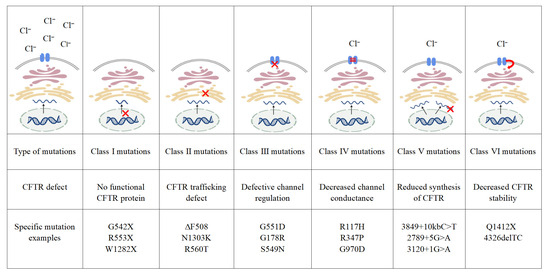 Classes of CFTR mutations [24]. Class I mutations result in no protein production, red symbol in class I mutations indicate truncated, nonfunctional mRNA produced in the nucleus. Class II mutations result in misfolded proteins being degraded via the proteasome pathway, red symbol in class II mutations indicate misfolded proteins failing to pass through the endoplasmic reticulum quality control system. Class III mutations impair channel opening, red symbol in class III mutations indicate the CFTR ion channel on the cell membrane failing to open. Class IV mutations show reduced conduction, wave lines in class IV mutations indicate reduced chloride ion transport efficiency. Class V mutations cause a significant reduction in mRNA or protein levels, or both, red symbol in class V mutations indicate unstable or nonfunctional mRNA produced in the cell nucleus. Class VI mutations reduce the stability of ion channels on the cytoplasmic membrane, red arrow in class VI mutations indicate that CFTR proteins reaching the cell membrane are prone to degradation; created in BioGDP. CFTR: cystic fibrosis transmembrane conductance regulator.