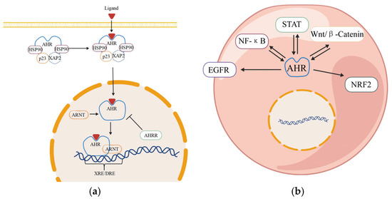 AHR signaling pathway; created in BioGDP. (a) AHR classic signaling pathway [34]; (b) AHR non-classical signaling pathway [35]. AHR: aryl hydrocarbon receptor. HSP90: heat shock protein 90. XAP2: X-associated protein 2. ARNT: aryl hydrocarbon receptor nuclear translocator. AHRR: aryl hydrocarbon receptor repressor. EGFR: epidermal growth factor receptor. NF-κB: nuclear factor kappa-B. STAT: signal transducer and activator of transcription. NRF2: nuclear factor erythroid 2-related factor 2.