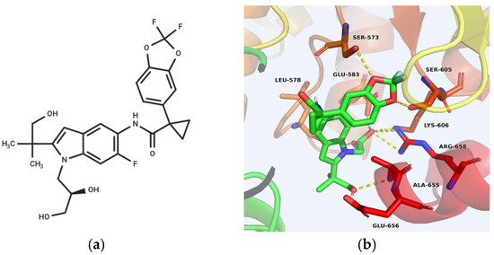 (a) Structure of Tezacaftor. (b) Key target interaction of Tezacaftor with CFTR [100].