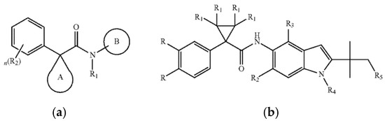 Beyond approved drugs, innovative research continues. For instance, an invention patent by Ruah, S.S.H et al. discloses a new class of indole-based CFTR modulators. These compounds feature an indole core scaffold (Figure 4). The indole ring serves as the core skeleton, and the activity, selectivity, and pharmacokinetic properties of the compounds are regulated by introducing diverse substituents onto the indole ring. Preclinical functional studies using membrane potential measurement techniques demonstrate that these compounds effectively enhance chloride transport mediated by the F508del-CFTR mutant, confirming their potential to correct the functional defects of CFTR. The patent also outlines their suitability for various formulations and potential for use in combination therapies, highlighting significant development potential [101].