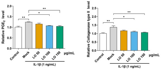 2.2. LO Leaf Extract Reduces IL-1β-Induced Secretion of PGE2 and Collagenase in Primary Chondrocytes