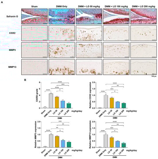 2.4. Histological Assessment of Cartilage Protection by LO Leaf Extract in a DMM-Induced OA Mouse Model