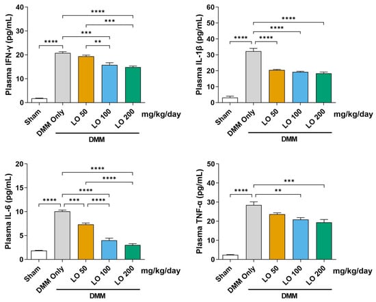 2.5. Modulatory Effect of LO Leaf Extract on Systemic Inflammatory Cytokines in a DMM-Induced OA Mouse Model