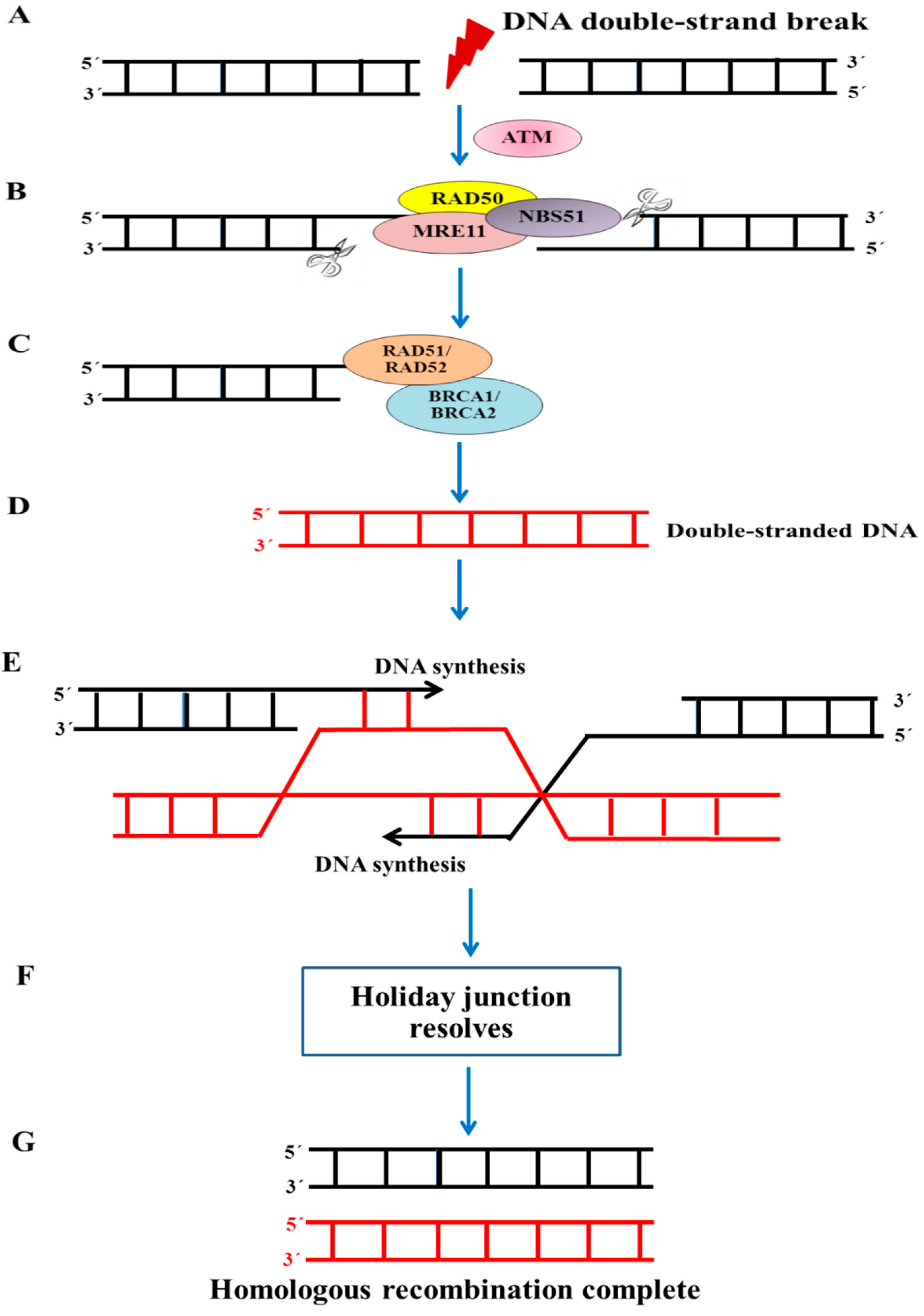 Since the discovery of the breast cancer susceptibility gene, BRCA1, which is located on chromosome 17q, significant advances have been made in understanding the structure and function of the BRCA1 protein. The BRCA1 protein accounts for its ability to maintain genomic integrity and suppress tumor formation through several cellular processes, such as the DNA damage repair pathway, transcription regulation, cell cycle progression, apoptosis, and protein ubiquitination [14,38]. Several lines of evidence have supported an important role of the BRCA1 protein in repairing DNA double-stranded breaks (DSBs) via the homologous recombination (HR) pathway. HR depends on the presence of sister chromatids formed during DNA synthesis as a template for exchanging a homologous sequence with a single-stranded sequence. Thus, this pathway is only available during the S/G2 phases of the cell cycle. Such a repair process requires the recruitment of many proteins to make up a complex that acts as a concert in repairing DNA damage. The underlying molecular mechanism of the HR repair pathway is schematically proposed in Figure 1. A DSB, after being exposed to chemotherapeutics, ionizing radiation, or DNA-damaging agents, activates the ataxia telangiectasia mutated (ATM) kinase, which subsequently catalyzes the MRE11/RAD50/NBS1 (MRN) complex. The MRN complex then recognizes the site of the DNA damage and uses its 5′ ⟶ 3′ exonuclease activity (depicted by scissors) to create single-stranded 3′ ends. Participating proteins such as BRCA1, BRCA2, RAD51, and RAD52 are simultaneously recruited to the DNA-damaged sites [39,40]. BRCA1 interacts with BRCA2 to facilitate the nuclear transport of RAD51. RAD52 aids in RAD51 binding to the damaged ends to form a nucleoprotein filament. RAD51 exchanges a homologous sequence from a single strand within a double-stranded molecule (the sister chromatid as a template) with a single-stranded sequence. Resolvases then restore the junctions (termed Holliday junctions) as a result of homologous recombination. Finally, two copies of an error-free DNA molecule are produced. However, in the absence or impairment of BRCA1, the alternative pathway of non-homologous end joining repair (NHEJ) may be required. The NHEJ pathway is less accurate than the HR pathway because it does not use the sister chromatid as a template [41,42]. This may lead to defective repair and enhance the toxicity of the DNA damage. In addition, BRCA1 has been shown to be involved in nucleotide excision repair (NER), demonstrating a close association between the transcription-coupled repair (TCR) pathway [43,44] and the increased cisplatin sensitivity in BRCA1-deficient cells [45,46].