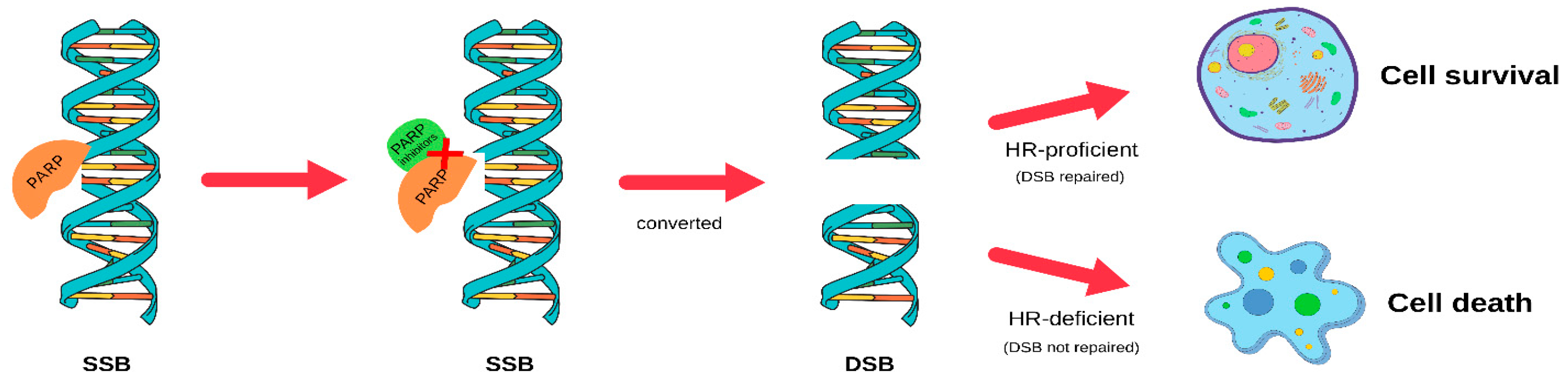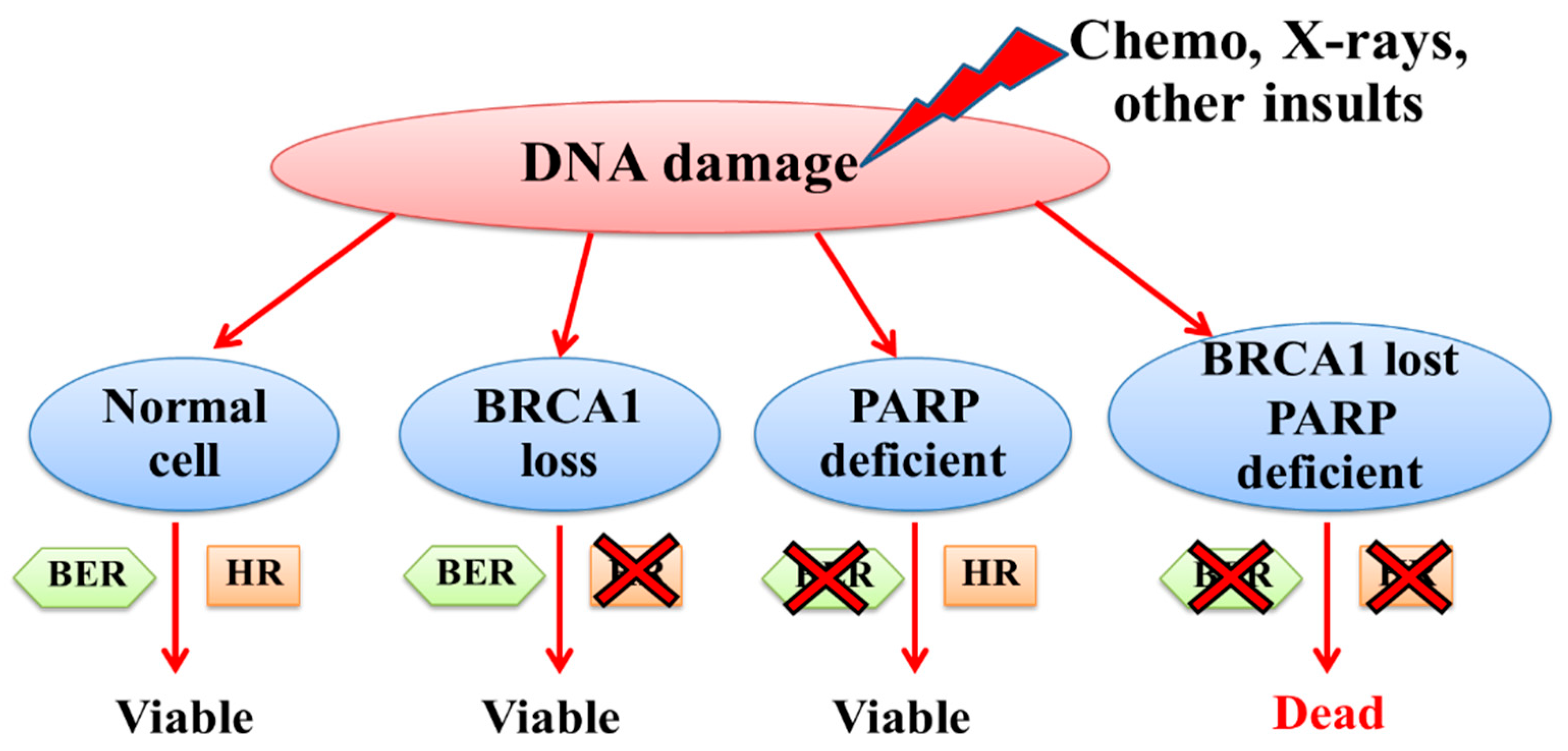 PARP is a highly abundant DNA-binding protein that plays an important role in estrogen-related transcription, chromatin remodeling, and the DNA repair pathway, particularly in the base excision repair of single-stranded DNA breaks (SSBs) [3,74]. Inhibition of PARP leads to the accumulation of SSBs that finally cause the formation of DSBs (Figure 4) after interfering with DNA replication processes. These DSBs cannot be accurately repaired in cancer cells with HR deficiency [75]. Therefore, the inhibition of PARP using synthetic killing agents could be advanced as a novel targeted therapy for breast cancer patients with dysfunctional BRCA1 (Figure 5) [76].
