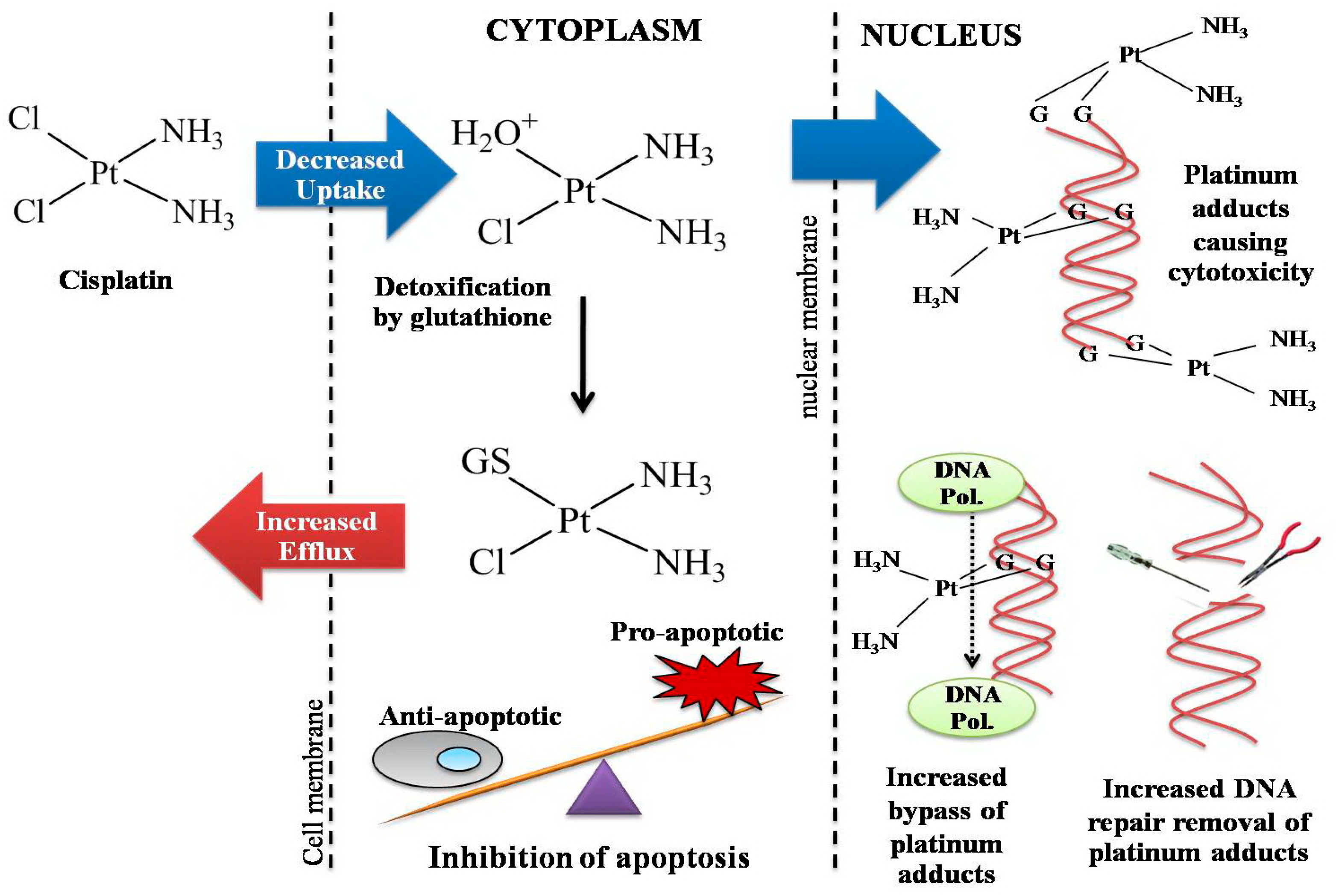 However, no clear-cut dominant mechanism of resistance to cisplatin has been identified in human cancer cells. Cisplatin resistance of a particular cell may be due to several possible mechanisms. Moreover, a given cell may use more than one mechanism or can simultaneously develop several mechanisms of resistance. Other mechanisms may be involved in cellular resistance to cisplatin, such as altered folate metabolism [123], changes in oncogene expression [118], modulation by protein kinases [124], and loss of DNA mismatch repair [125]. In addition, an increased tolerance to DNA damage can be another explanation for increased resistance to cisplatin. Cells can achieve damage tolerance by bypassing DNA lesions during replication or transcription [126].