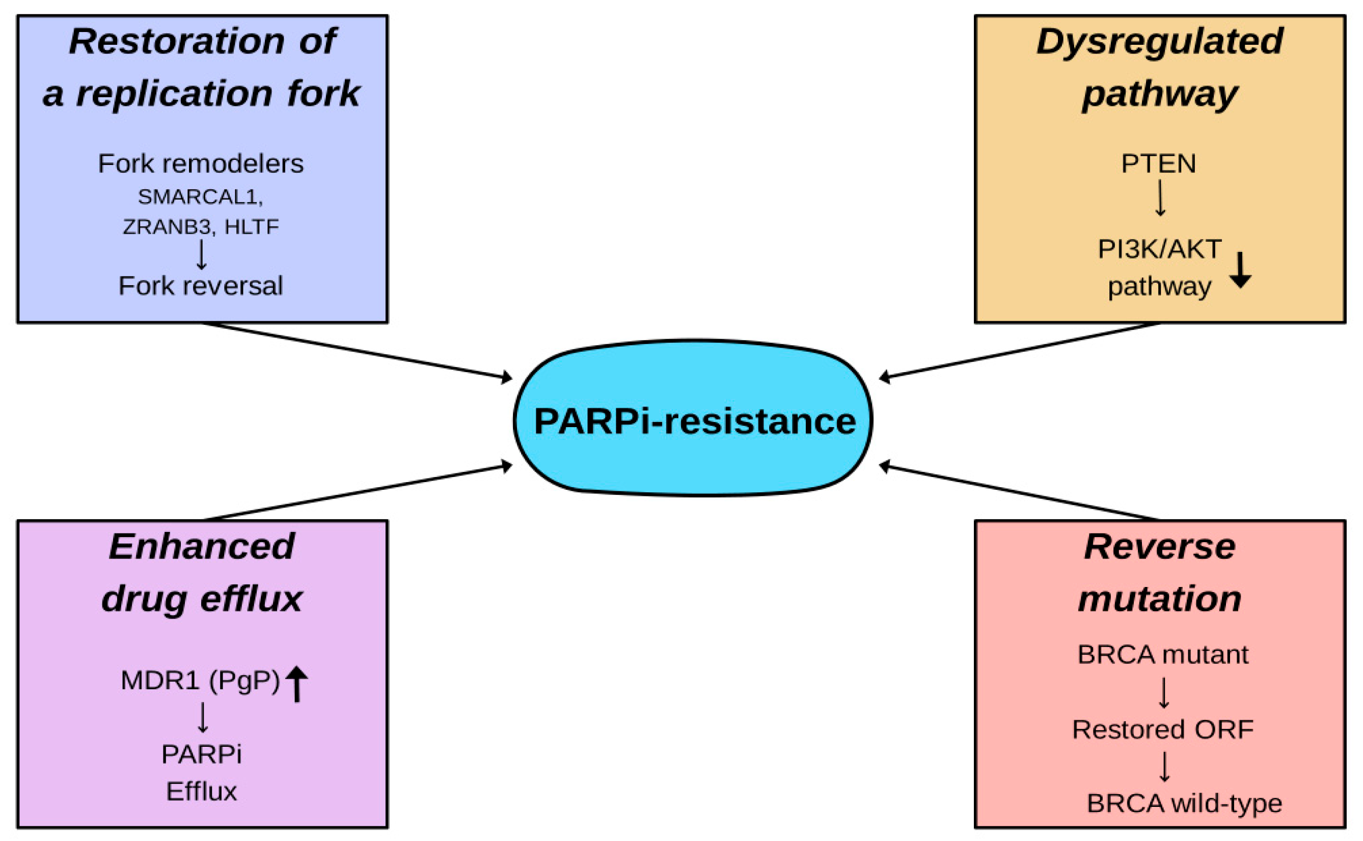 Cellular resistance to PARP inhibitors is caused by a wide variety of mechanisms, including reverse mutation, restoration of replication fork stability, dysregulation within molecular signaling pathways, and enhanced drug efflux, as depicted in Figure 7.